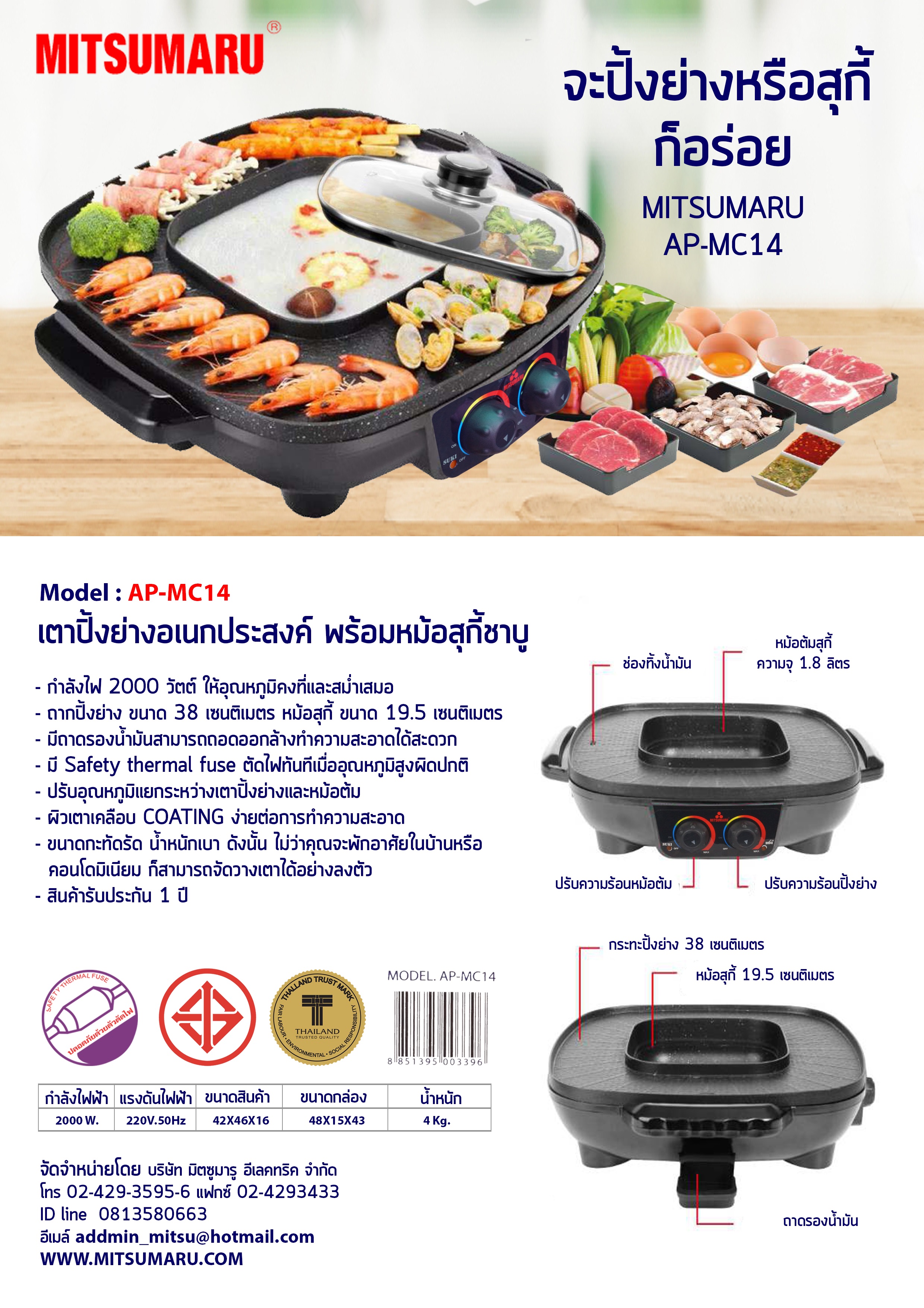เตาปิ้งย่างพร้อมหม้อสุกี้ ผิวหน้าเคลือบ coatingไม่ติดหน้าเตาเวลาปิ้งง่ายต่อการทำความสะอาดมี safety thermal fuse ตัดไฟทันทีที่อุณหภูมิสูงผิดปกติ มีสองหัวปรับแยกระหว่างเตาปิ้ง และหม้อต้ม มีช่องระบายน้ำมันบนเตา และมีถาดรองน้ำมันถาดเทได้ พร้อมฝาแก้วเพื่อความร้อนที่เร็วขึ้น แผ่นความร้อนรับประกัน 3 ปี มอก.1641-2552 สินค้ารับประกัน 1 ปี