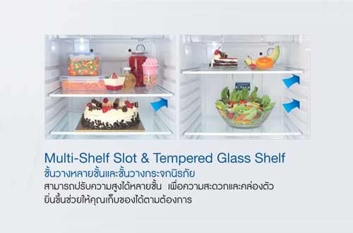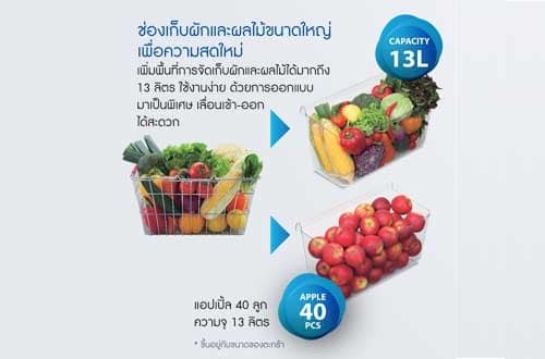 • ช่องเก็บผักและผลไม้ขนาดใหญ่เพื่อความสดใหม่ เพิ่มพื้นที่การจัดเก็บผักและผลไม้ได้มากถึง 13 ลิตร ใช้งานง่าย ด้วยการออกแบบมาเป็นพิเศษ เลื่อนเข้าออกได้สะดวก
