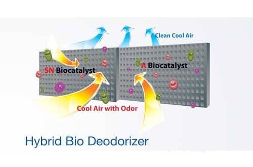 Hybrid Bio Deodorizeสามารถกรองและสลายกลิ่นที่เกิดจากสารกำมะถัน ไนโตเจน และแอลดีไฮด์จากอาหาร ทำให้อากาศภายในตู้เย็นสดชื่นขึ้น นอกจากนี้สารโลหะเงินใน Hybrid Bio ยังช่วยย่อยสลายโมเลกุลของกลิ่นที่ไม่พึงประสงค์ และ