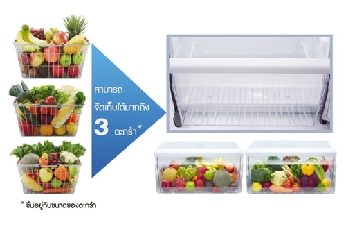 - ช่องเก็บผัก และผลไม้ขนาดใหญ่ เพื่อเพิ่มพื้นที่การจัดเก็บผัก และผลไม้ได้มากถึง 53 ลิตร สามารถจัดเก็บได้มากถึง 3 ตะกร้า ใช้งานง่าย เลื่อนเข้าออกสะดวก