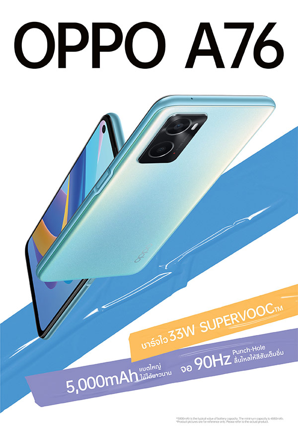 เลือกจากสีฟ้าน้ำทะเลที่สงบนิ่งของท้องทะเล หรือสีดำสนิทที่แสดงออกถึงความหรูหราและมีระดับ ไม่ว่าสไตล์ของคุณจะเป็นแบบไหน OPPO A76 ก็มีสีสันที่เหมาะกับคุณ